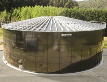 410,000 Gallon Glass-Fused Bolted Steel Tank measuring 42-ft in diameter and 40-ft at the peak, fabricated with glass-fused steel panels bolted together using mastic and gaskets to ensure a watertight seal. The glass-fused-to-steel process ensures that water never touches the metal panels. Glass Fused Steel (GFS) tanks are a great example of the innovation occurring in the tank industry today.
