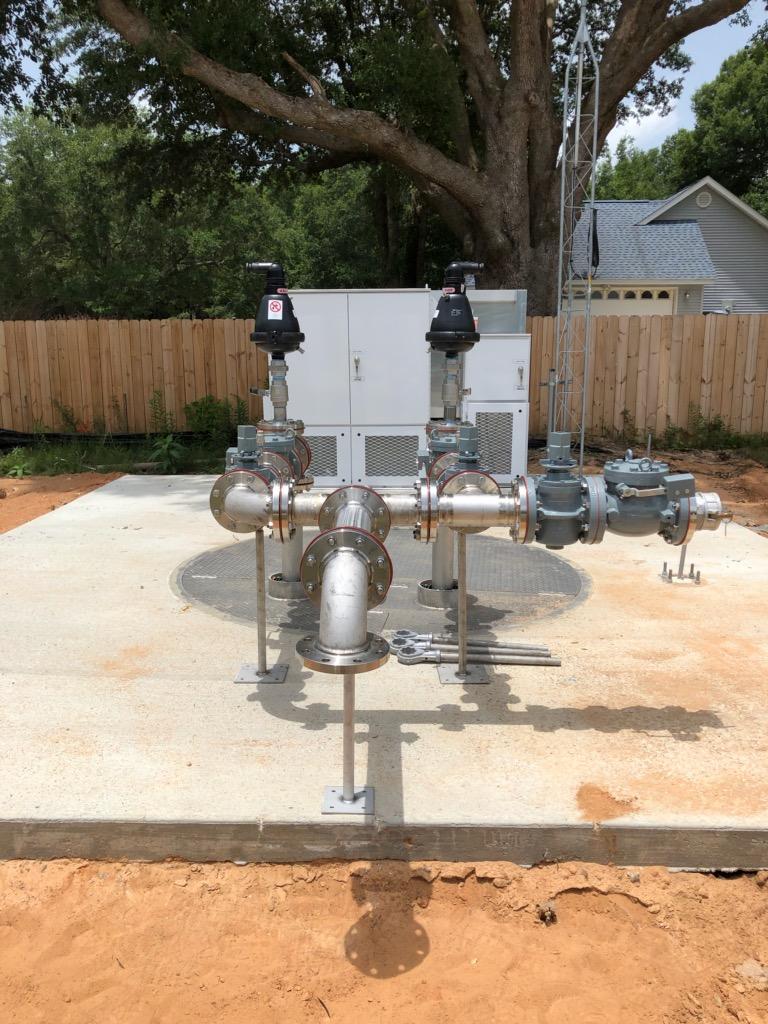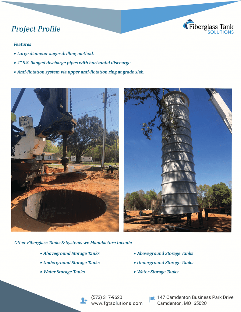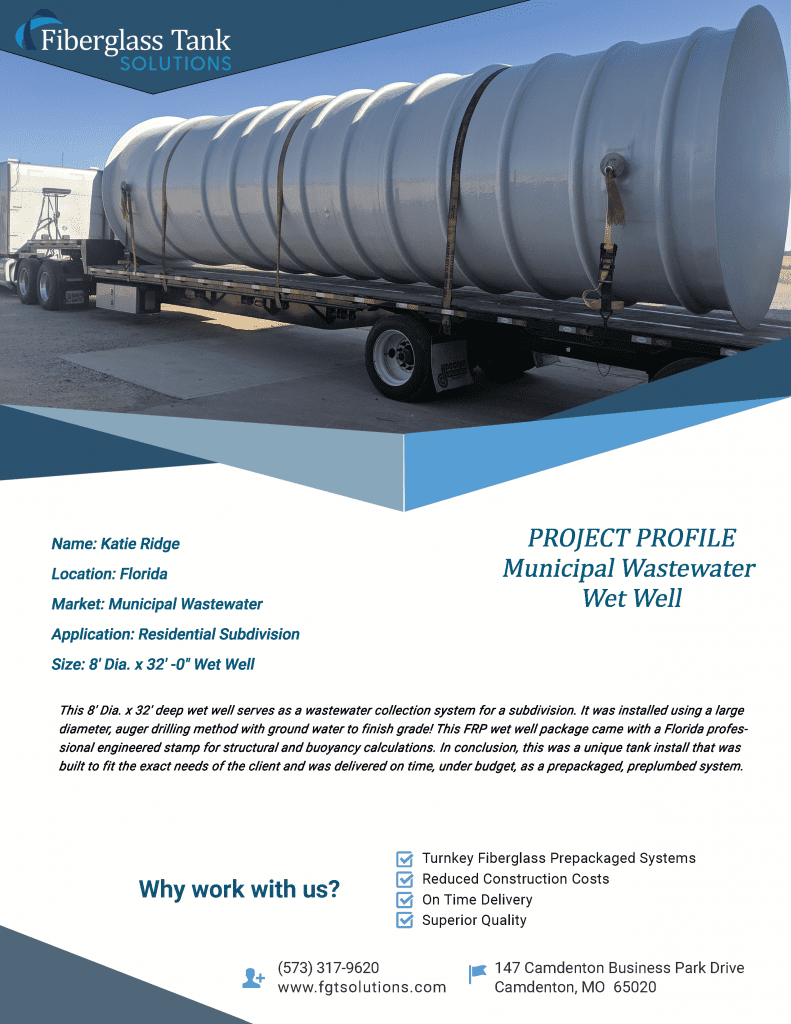 This 8′ Dia. x 32′ deep wet well serves as a wastewater collection system for a subdivision. It was installed using a large diameter, auger drilling method with ground water to finish grade! This FRP wet well package came with a Florida professional engineered stamp for structural and buoyancy calculations. In conclusion, this was a unique tank install that was built to fit the exact needs of the client and was delivered on time, under budget as a prepackaged, pre-plumbed system.