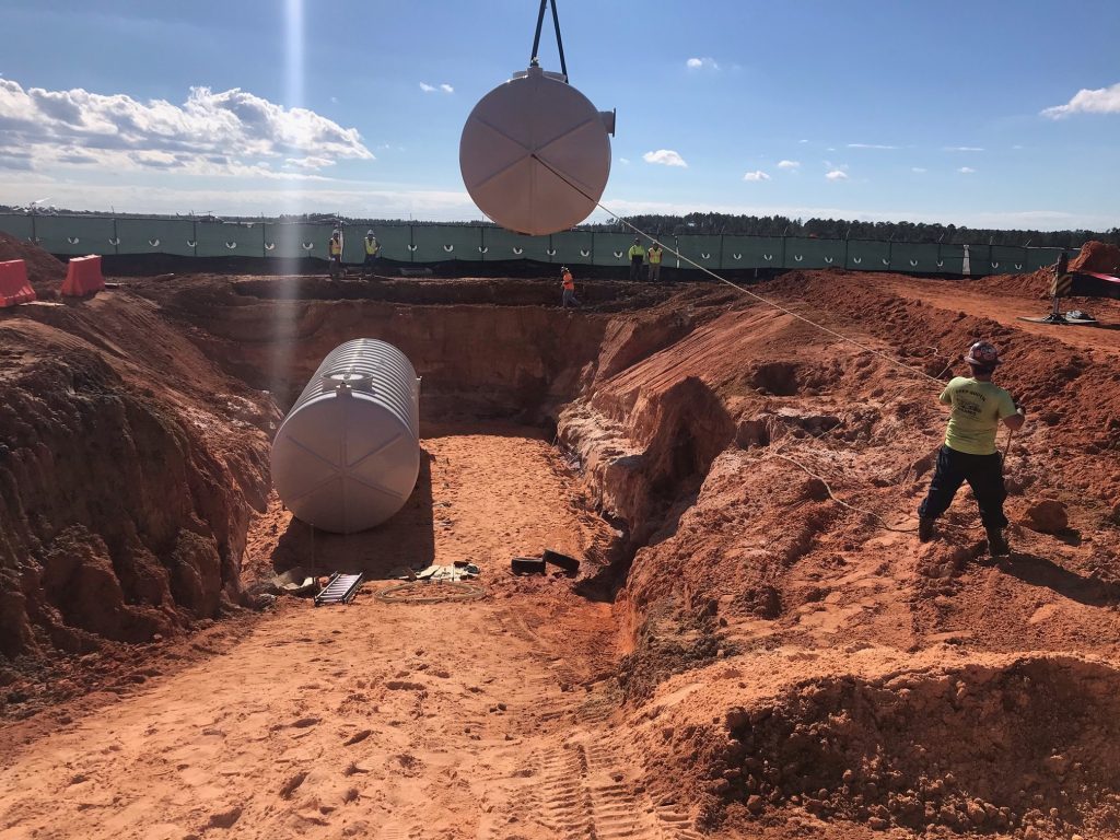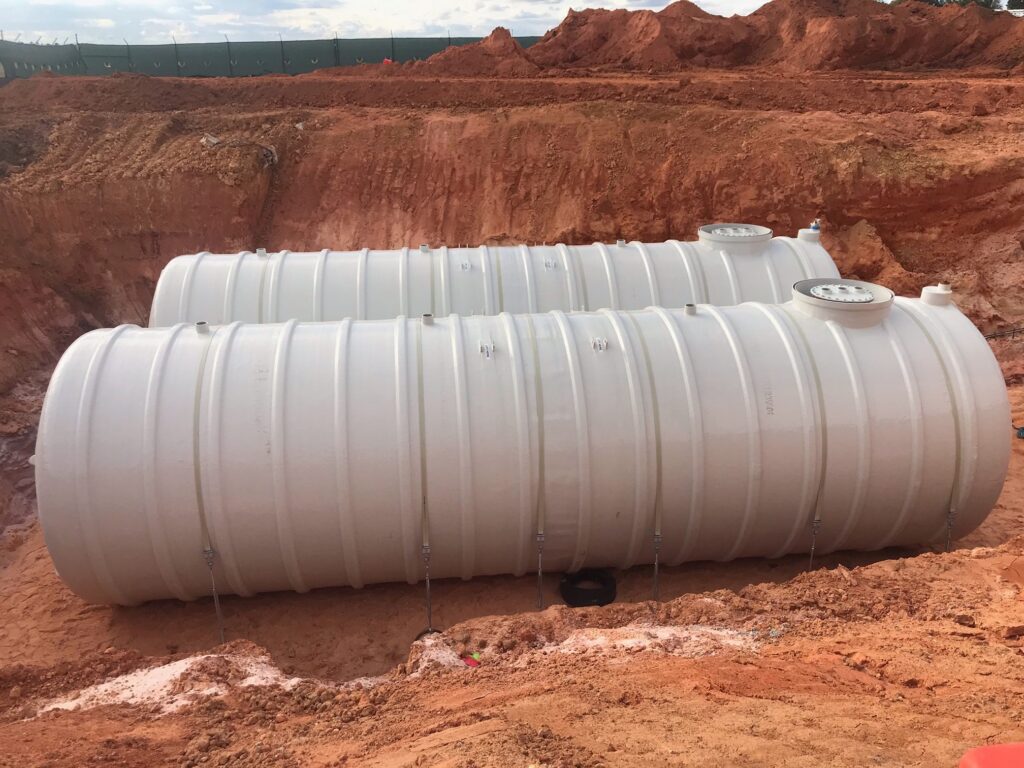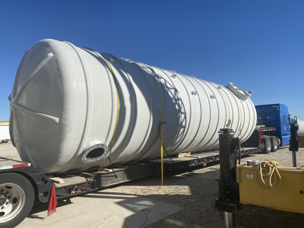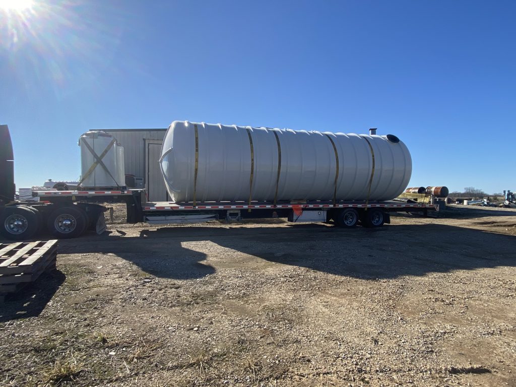 These Aqueous Film Forming Foam (AFFF) hazardous liquid collection tanks serve a military hanger location in Milton, Florida. The two tanks share volume with a common side pipe, are (DW) Double Wall, with 30” man-ways, sumps, and misc. threaded fittings. Each tank is fitted with interstitial monitoring sensors for assured reliability. For anti-flotation, an engineered concrete slab under tank was utilized for these shallow bury collection tanks. FTS is proud to confirm that these tanks were delivered on schedule, and under budget, as promised!