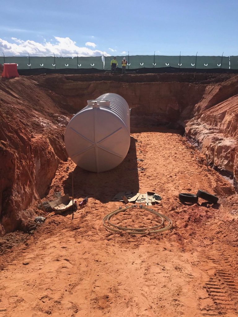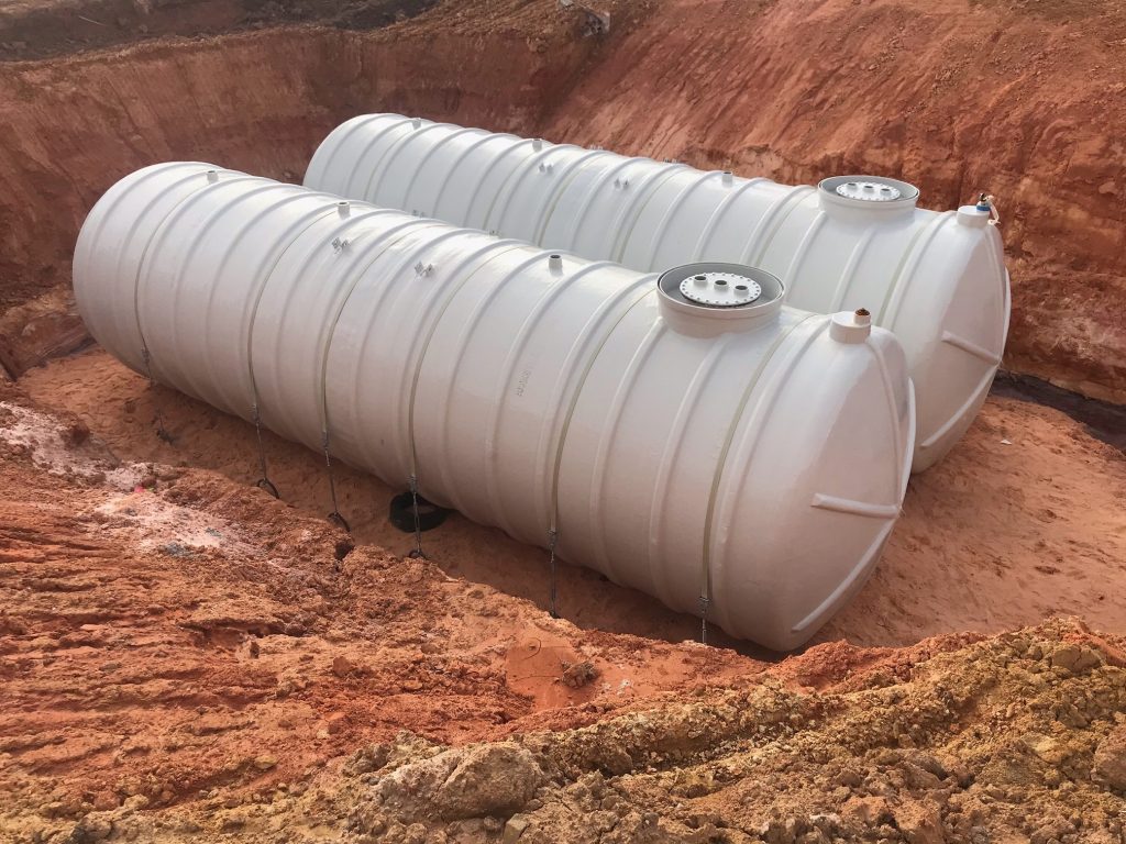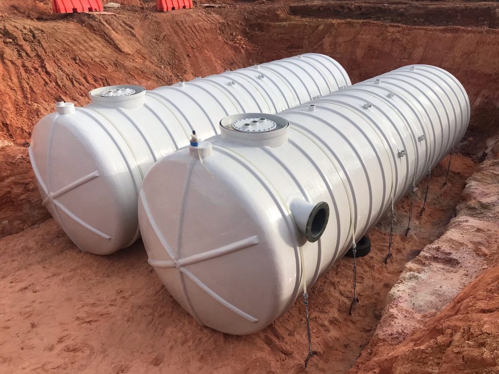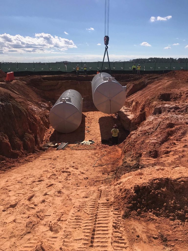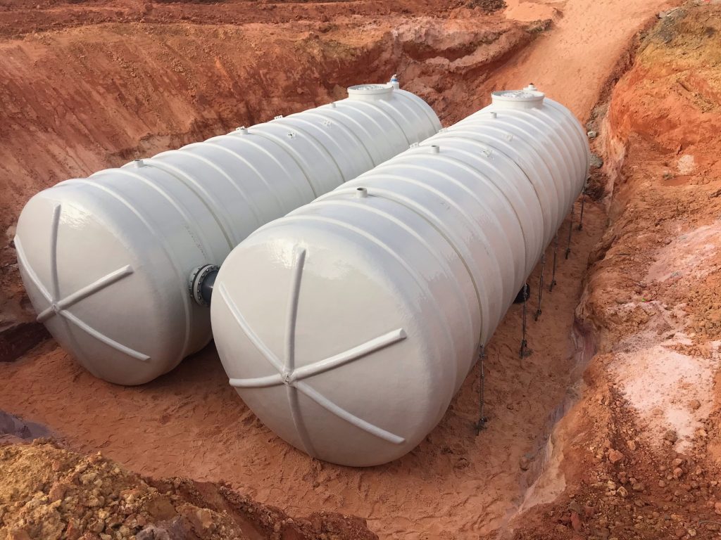 These Aqueous Film Forming Foam (AFFF) hazardous liquid collection tanks serve a military hanger location in Milton, Florida. The two tanks share volume with a common side pipe, are (DW) Double Wall, with 30” man-ways, sumps, and misc. threaded fittings. Each tank is fitted with interstitial monitoring sensors for assured reliability. For anti-flotation, an engineered concrete slab under tank was utilized for these shallow bury collection tanks. FTS is proud to confirm that these tanks were delivered on schedule, and under budget, as promised!