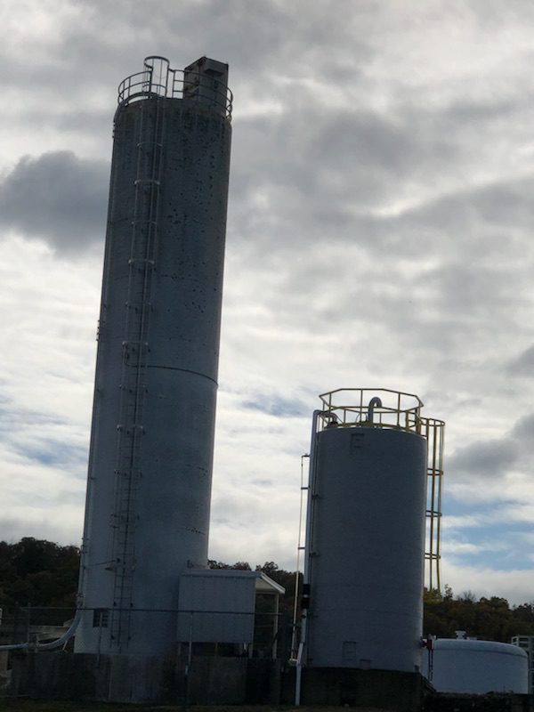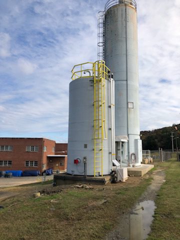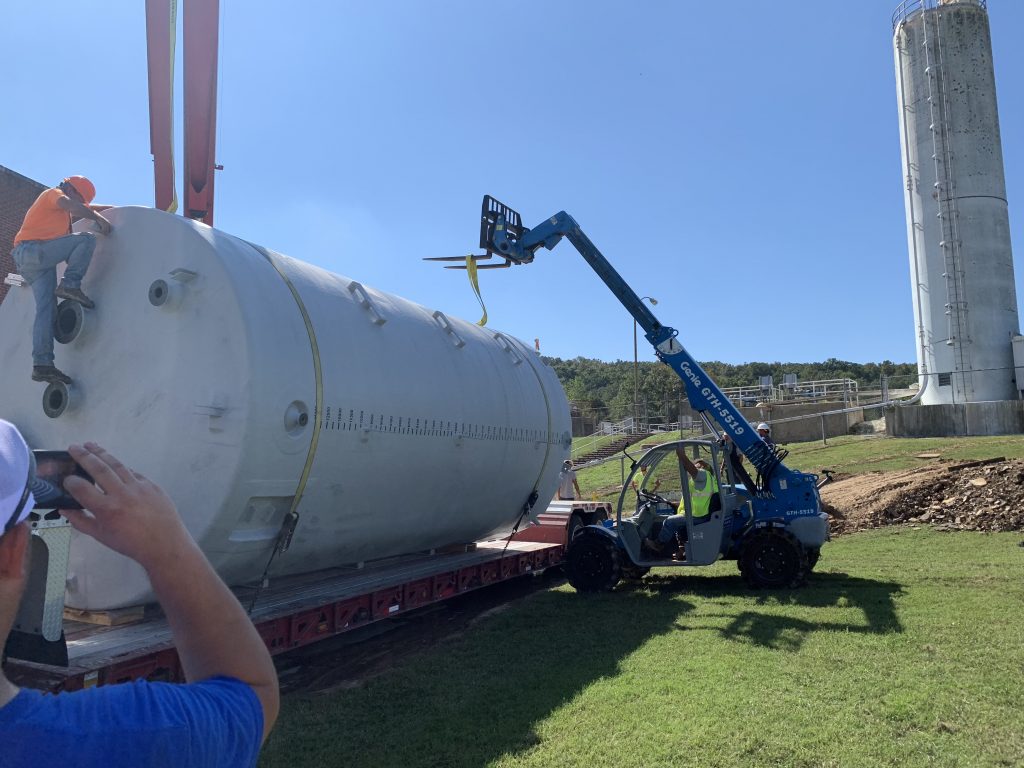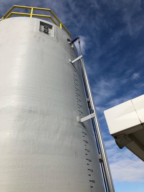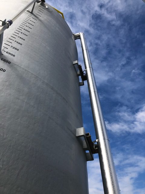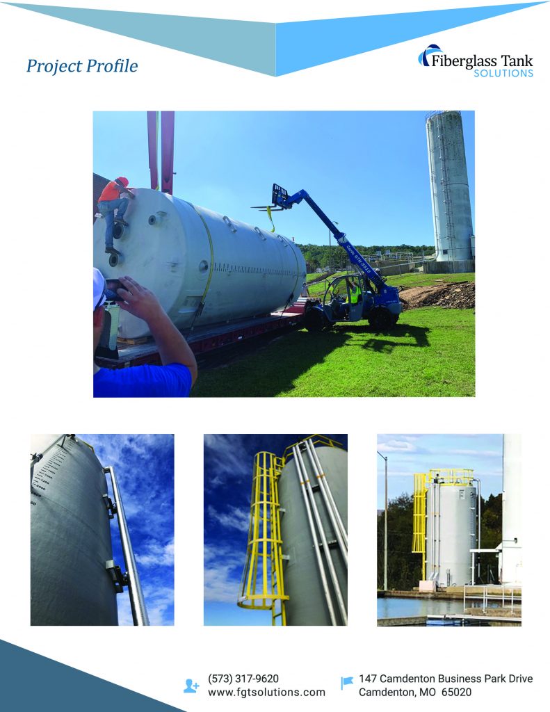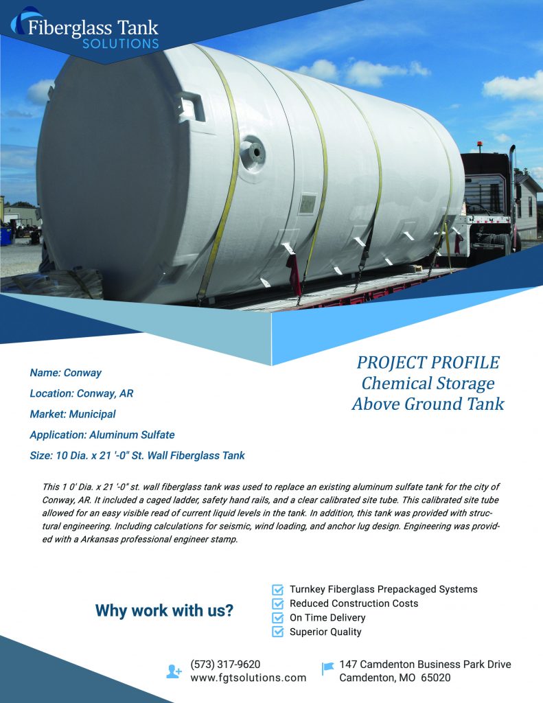 This 1 0′ Dia. x 21 ‘-0″ st. wall fiberglass tank was used to replace an existing aluminum sulfate tank for the city of Conway, AR. It included a caged ladder, safety hand rails, and a clear calibrated site tube. This calibrated site tube allowed for an easy visible read of current liquid levels in the tank. In addition, this tank was provided with structural engiĀneering. Including calculations for seismic, wind loading, and anchor lug design. EngineerĀing was provided with a Arkansas professional engineer stamp.