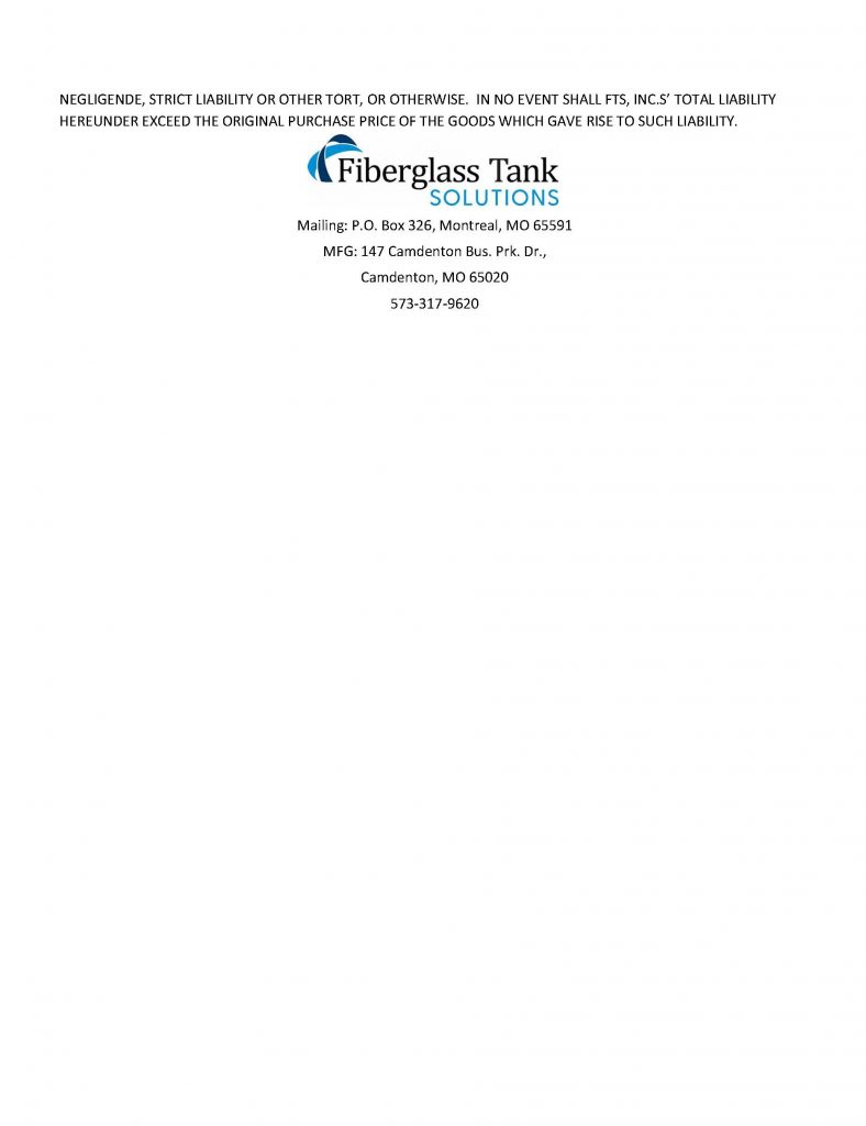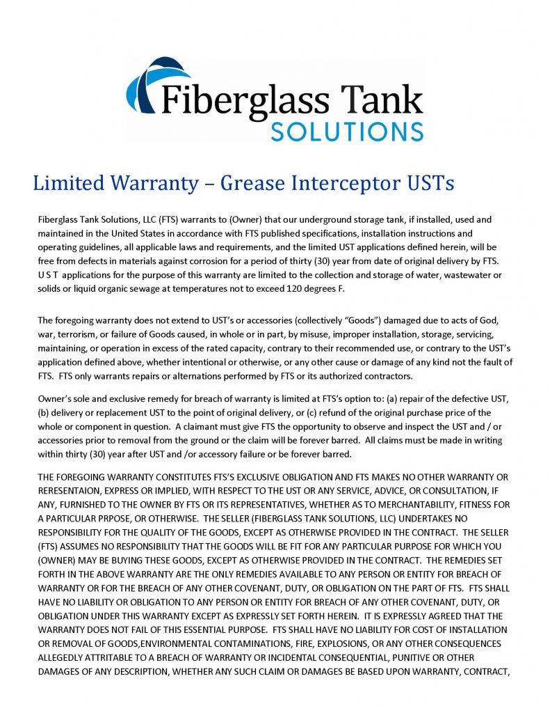 Fiberglass Tank Solutions, LLC (FTS) warrants to (Owner) that our underground storage tank, if installed, used and maintained in the United States in accordance with FTS published specifications, installation instructions and operating guidelines, all applicable laws and requirements, and the limited UST applications defined herein, will be free from defects in materials against corrosion for a period of thirty (30) year from date of original delivery by FTS. UST applications for the purpose of this warranty are limited to the collection and storage of water, wastewater or solids or liquid organic sewage at temperatures not to exceed 120 degrees F.