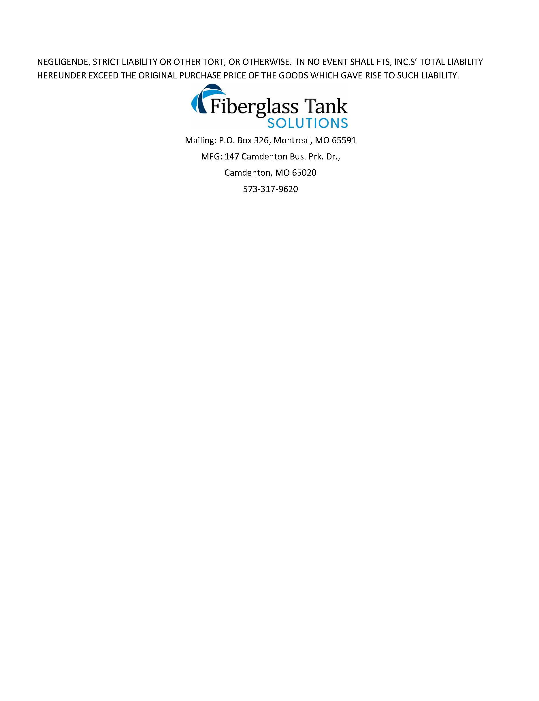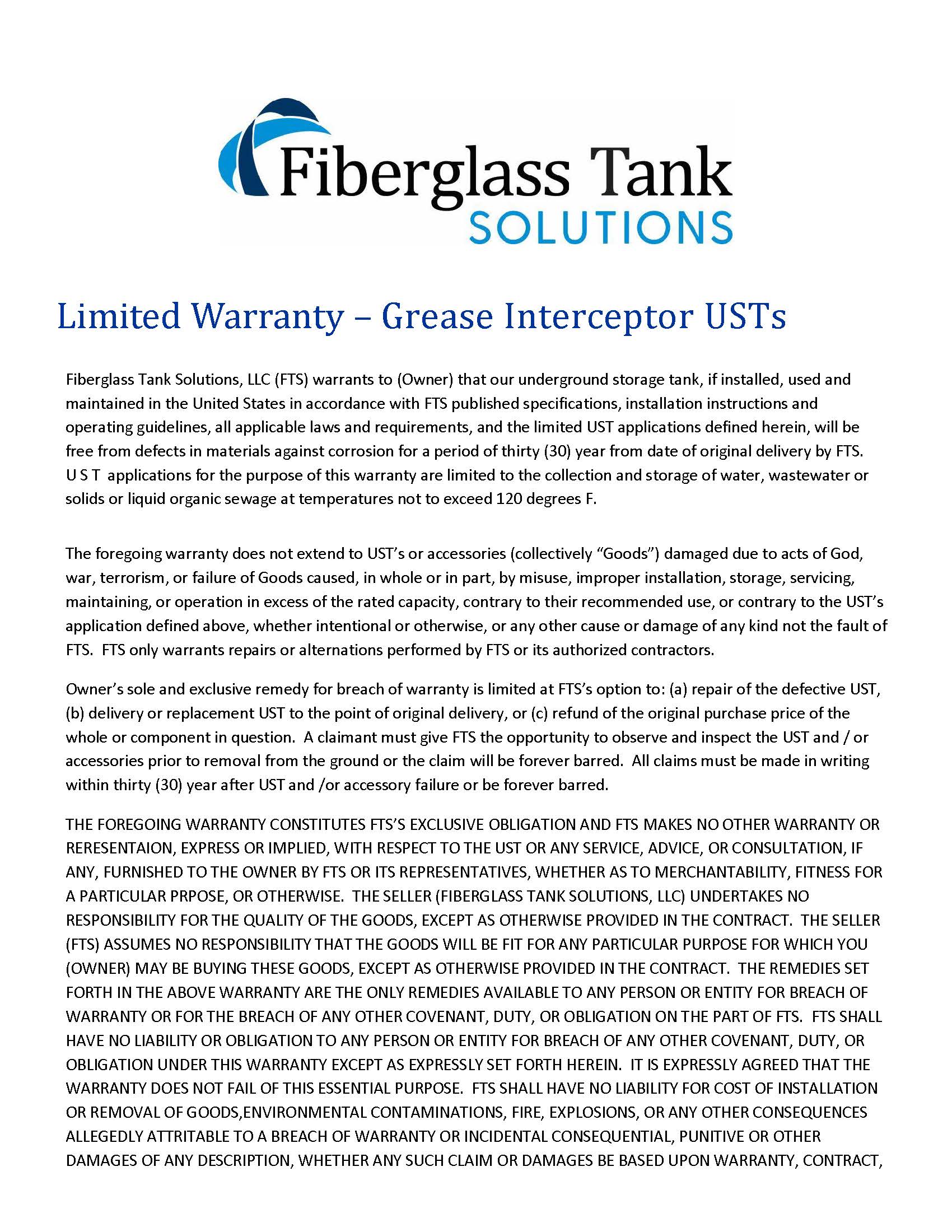 Fiberglass Tank Solutions, LLC (FTS) warrants to (Owner) that our underground storage tank, if installed, used and maintained in the United States in accordance with FTS published specifications, installation instructions and operating guidelines, all applicable laws and requirements, and the limited UST applications defined herein, will be free from defects in materials against corrosion for a period of thirty (30) year from date of original delivery by FTS. UST applications for the purpose of this warranty are limited to the collection and storage of water, wastewater or solids or liquid organic sewage at temperatures not to exceed 120 degrees F.