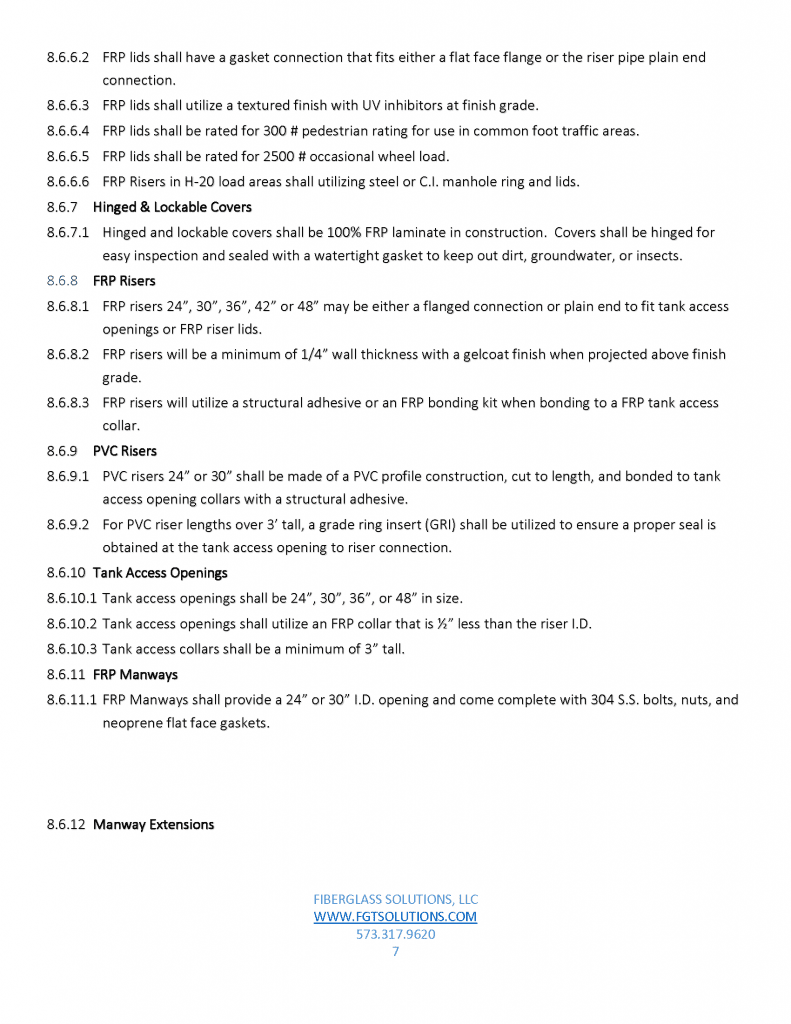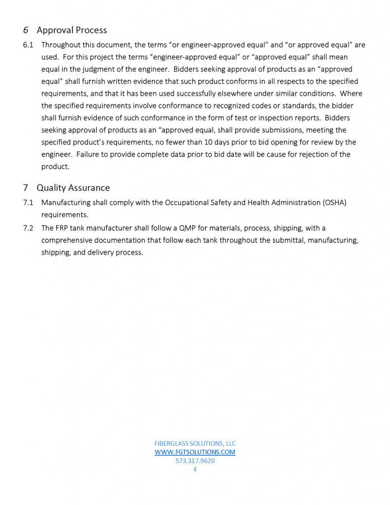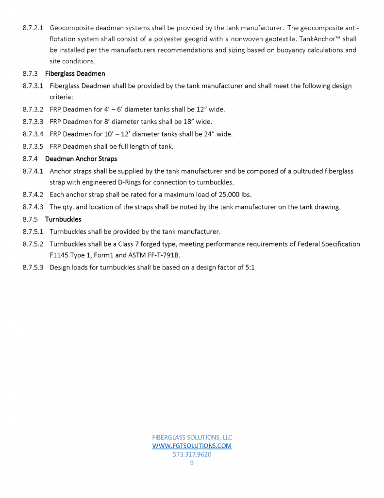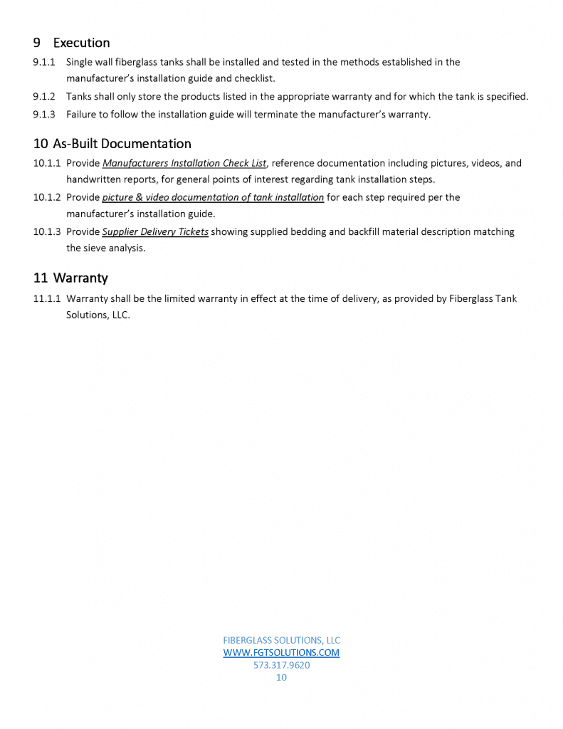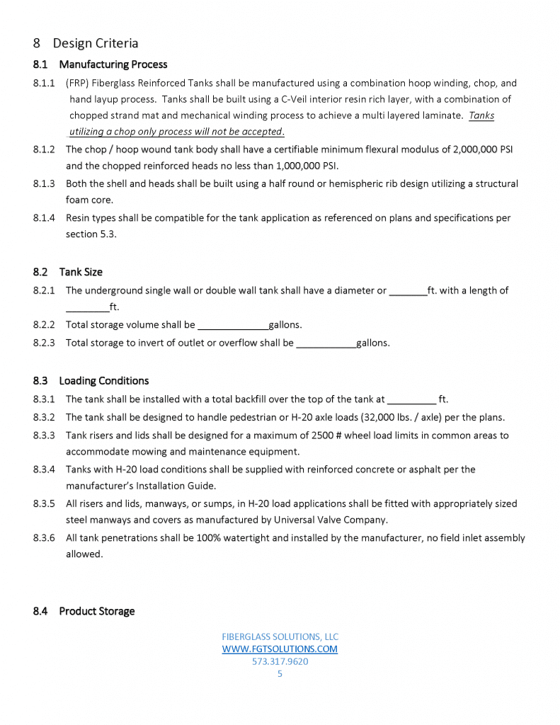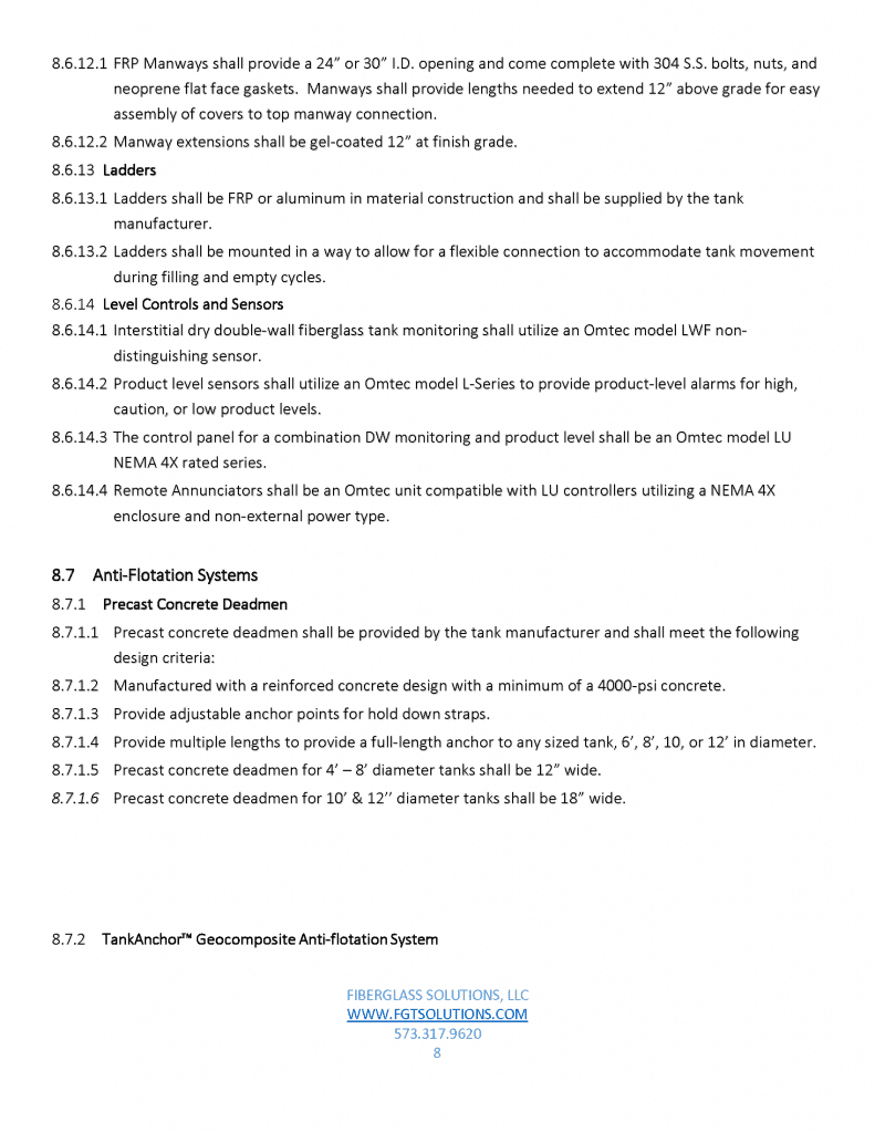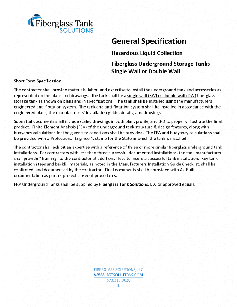 Short Form Specification The contractor shall provide materials, labor, and expertise to install the underground tank and accessories as represented on the plans and drawings. The tank shall be a single wall (SW) or double wall (DW) fiberglass storage tank as shown on plans and in specifications. The tank shall be installed using the manufacturers engineered anti-flotation system. The tank and anti-flotation system shall be installed in accordance with the engineered plans, the manufacturers’ installation guide, details, and drawings. Submittal documents shall include scaled drawings in both plan, profile, and 3-D to properly illustrate the final product. Finite Element Analysis (FEA) of the underground tank structure & design features, along with buoyancy calculations for the given site conditions shall be provided. The FEA and buoyancy calculations shall be provided with a Professional Engineer’s stamp for the State in which the tank is installed. The contractor shall exhibit an expertise with a reference of three or more similar fiberglass underground tank installations. For contractors with less than three successful documented installations, the tank manufacturer shall provide “Training” to the contractor at additional fees to insure a successful tank installation. Key tank installation steps and backfill materials, as noted in the Manufacturers Installation Guide Checklist, shall be confirmed, and documented by the contractor. Final documents shall be provided with As-Built documentation as part of project closeout procedures. FRP Underground Tanks shall be supplied by Fiberglass Tank Solutions, LLC or approved equals.