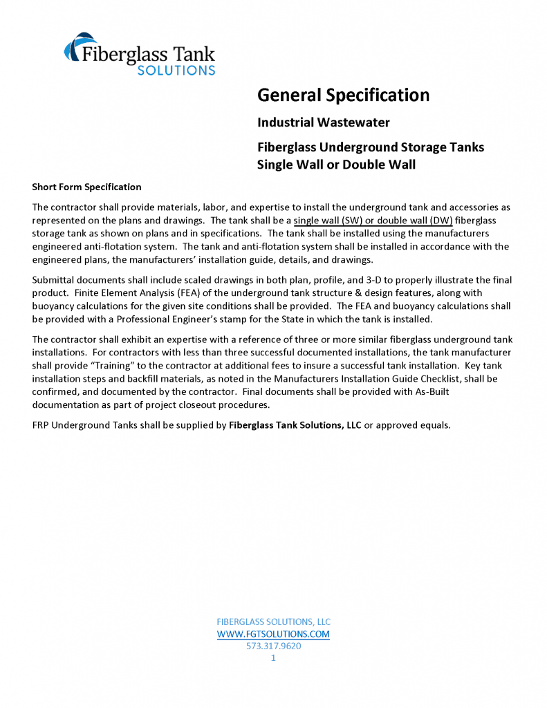 Short Form Specification The contractor shall provide materials, labor, and expertise to install the underground tank and accessories as represented on the plans and drawings. The tank shall be a single wall (SW) or double wall (DW) fiberglass storage tank as shown on plans and in specifications. The tank shall be installed using the manufacturers engineered anti-flotation system. The tank and anti-flotation system shall be installed in accordance with the engineered plans, the manufacturers’ installation guide, details, and drawings. Submittal documents shall include scaled drawings in both plan, profile, and 3-D to properly illustrate the final product. Finite Element Analysis (FEA) of the underground tank structure & design features, along with buoyancy calculations for the given site conditions shall be provided. The FEA and buoyancy calculations shall be provided with a Professional Engineer’s stamp for the State in which the tank is installed. The contractor shall exhibit an expertise with a reference of three or more similar fiberglass underground tank installations. For contractors with less than three successful documented installations, the tank manufacturer shall provide “Training” to the contractor at additional fees to insure a successful tank installation. Key tank installation steps and backfill materials, as noted in the Manufacturers Installation Guide Checklist, shall be confirmed, and documented by the contractor. Final documents shall be provided with As-Built documentation as part of project closeout procedures. FRP Underground Tanks shall be supplied by Fiberglass Tank Solutions, LLC or approved equals.