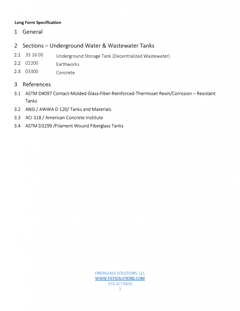 Short Form Specification The contractor shall provide materials, labor, and expertise to install the underground tank and accessories as represented on the plans and drawings. The tank shall be a single wall (SW) or double wall (DW) fiberglass storage tank as shown on plans and in specifications. The tank shall be installed using the manufacturers engineered anti-flotation system. The tank and anti-flotation system shall be installed in accordance with the engineered plans, the manufacturers’ installation guide, details, and drawings. Submittal documents shall include scaled drawings in both plan, profile, and 3-D to properly illustrate the final product. Finite Element Analysis (FEA) of the underground tank structure & design features, along with buoyancy calculations for the given site conditions shall be provided. The FEA and buoyancy calculations shall be provided with a Professional Engineer’s stamp for the State in which the tank is installed. The contractor shall exhibit an expertise with a reference of three or more similar fiberglass underground tank installations. For contractors with less than three successful documented installations, the tank manufacturer shall provide “Training” to the contractor at additional fees to insure a successful tank installation. Key tank installation steps and backfill materials, as noted in the Manufacturers Installation Guide Checklist, shall be confirmed, and documented by the contractor. Final documents shall be provided with As-Built documentation as part of project closeout procedures. FRP Underground