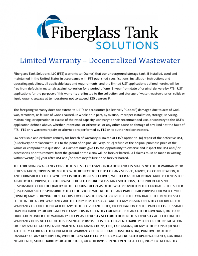 Fiberglass Tank Solutions, LLC (FTS) warrants to (Owner) that our underground storage tank, if installed, used and maintained in the United States in accordance with FTS published specifications, installation instructions and operating guidelines, all applicable laws and requirements, and the limited UST applications defined herein, will be free from defects in materials against corrosion for a period of one (1) year from date of original delivery by FTS. UST applications for the purpose of this warranty are limited to the collection and storage of water, wastewater or solids or liquid organic sewage at temperatures not to exceed 120 degrees F.