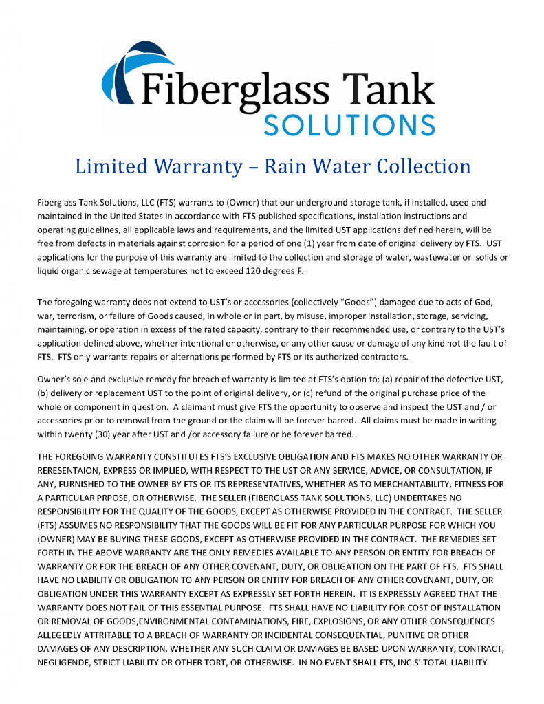 Fiberglass Tank Solutions, LLC (FTS) warrants to (Owner) that our underground storage tank, if installed, used and maintained in the United States in accordance with FTS published specifications, installation instructions and operating guidelines, all applicable laws and requirements, and the limited UST applications defined herein, will be free from defects in materials against corrosion for a period of one (1) year from date of original delivery by FTS. UST